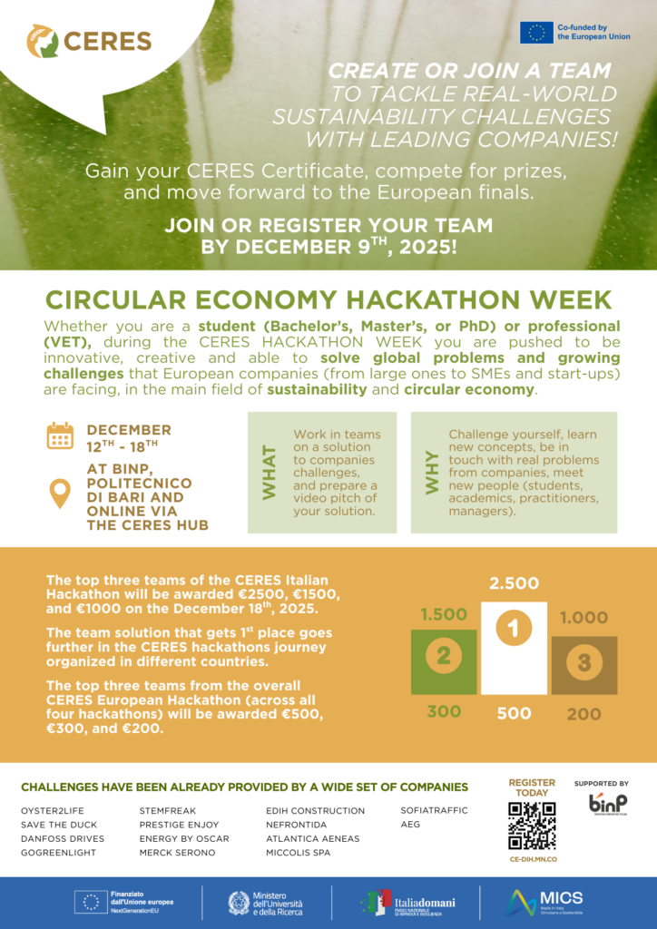 The CERES Italian Hackathon is organised by Politecnico di Bari, BinP – Boosting Innovation in Poliba and MICS – Made in Italy Circolare e Sostenibile in collaboration with CERES project partners, and with the support of leading companies engaged in the circular transition.
